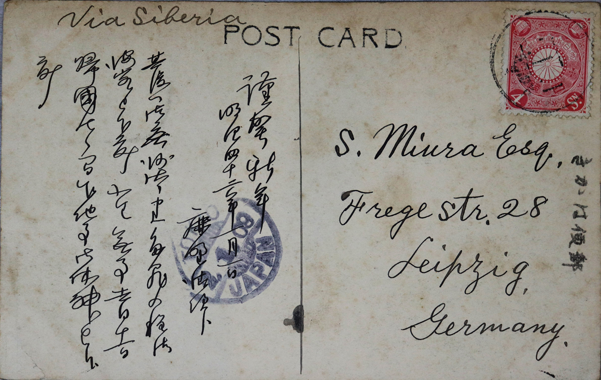- 内容:年賀状。12月11日無事帰国。/絵種別:写真/絵分類:風景/絵国名:台湾/絵内容:総督官邸/絵柄の種類:風景(その他)/留学期間:再びライプチヒ大学時代/三浦と葉書の関係:三浦宛