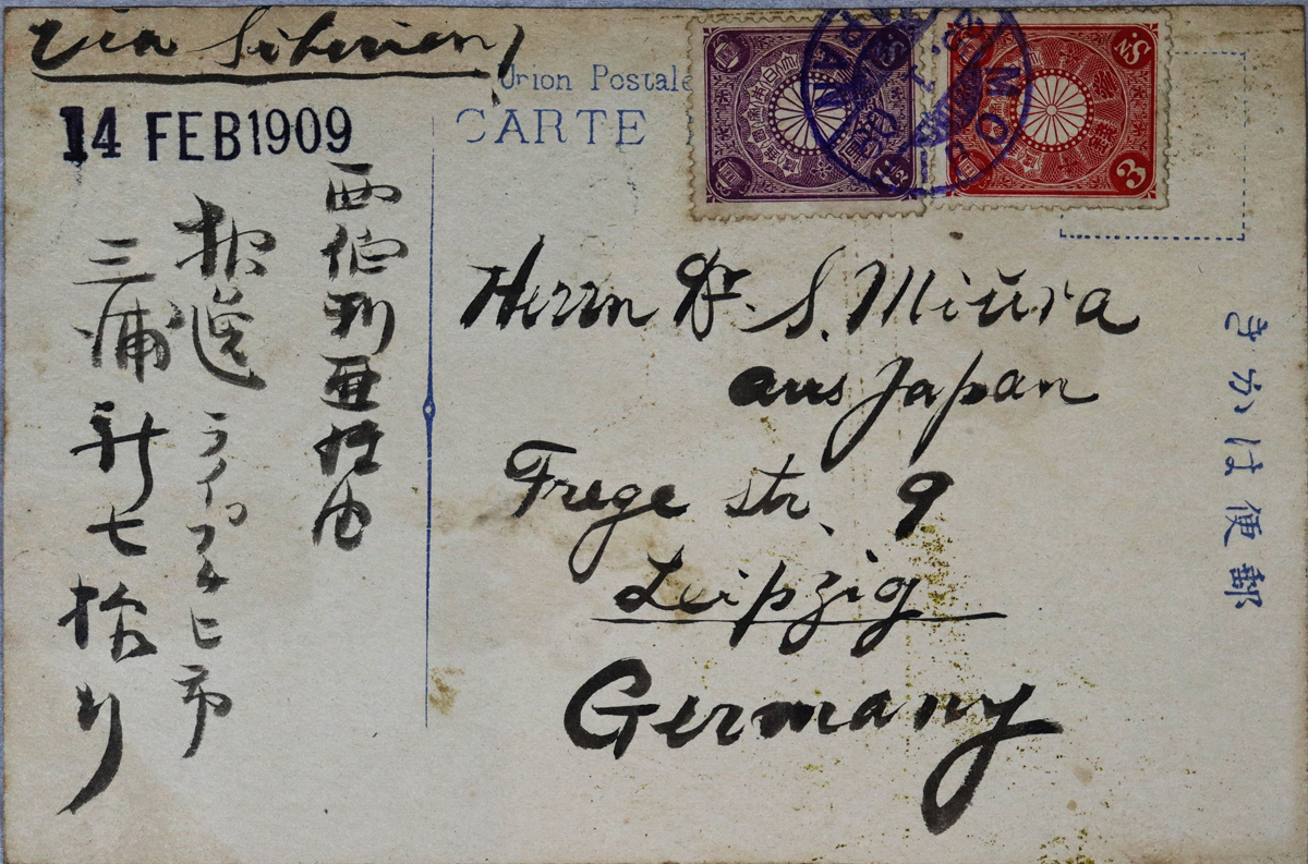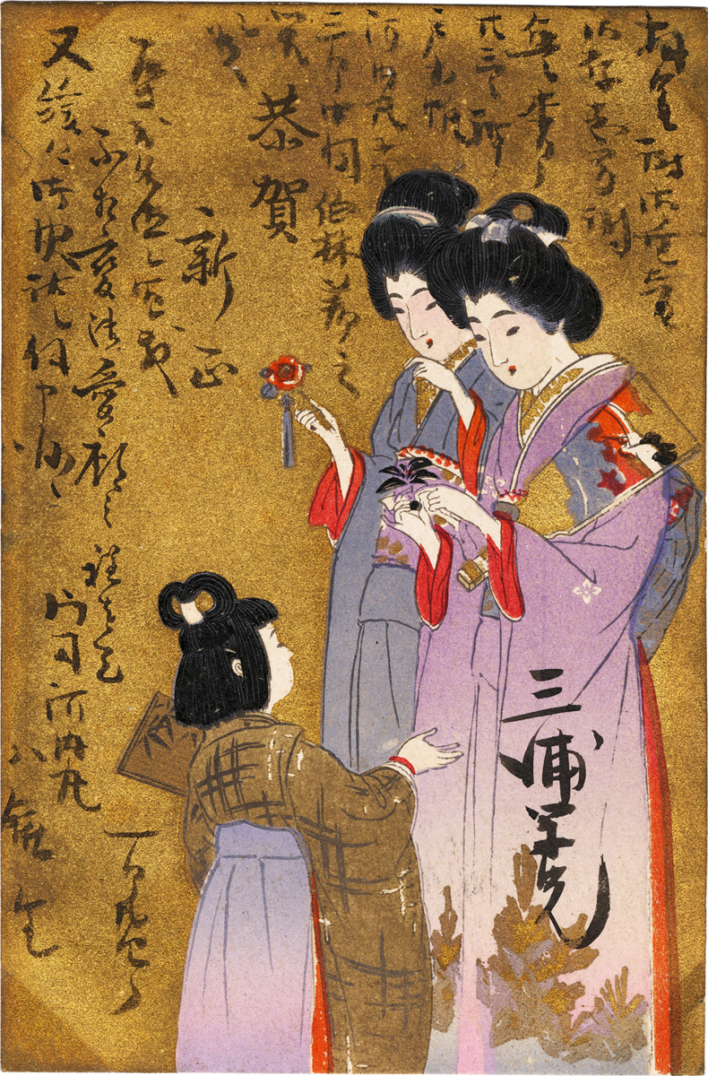 - 内容:年賀状。23日神戸出帆。3月中旬伯林着。/絵種別:絵/絵分類:文化/絵国名:日本/絵内容:女性|着物|子供|羽子板|ハネツキ|着物|日本髪/絵柄の種類:文化/留学期間:再びライプチヒ大学時代/三浦と葉書の関係:三浦宛