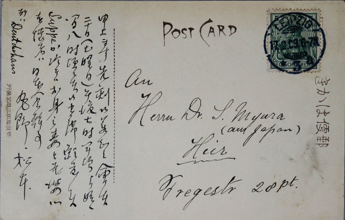 - 内容:日本人会の会合への出席依頼。/絵種別:写真/絵分類:風景/絵国名:ドイツ/絵内容:奈良|帝室博物館|庭園/絵柄の種類:風景(ドイツ)/留学期間:再びライプチヒ大学時代/三浦と葉書の関係:三浦宛