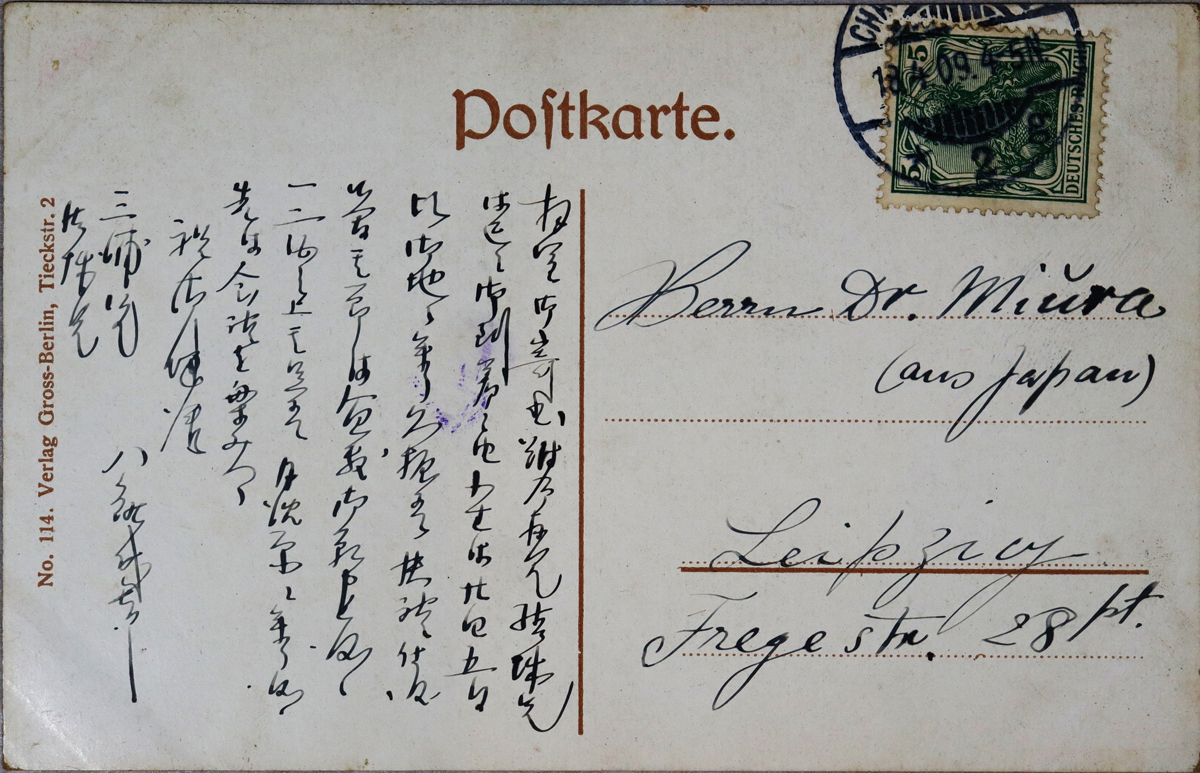- 内容:結城兄到着の由。自分は24日ないし25日に御地に参り、その後月沈原(ゲッチンゲン)にいきたい。/絵種別:写真/絵分類:風景/絵国名:ドイツ/絵内容:ベルリン|フリードリヒ通り|ライプツィガー通り/絵柄の種類:風景(ドイツ)/留学期間:再びライプチヒ大学時代/三浦と葉書の関係:三浦宛