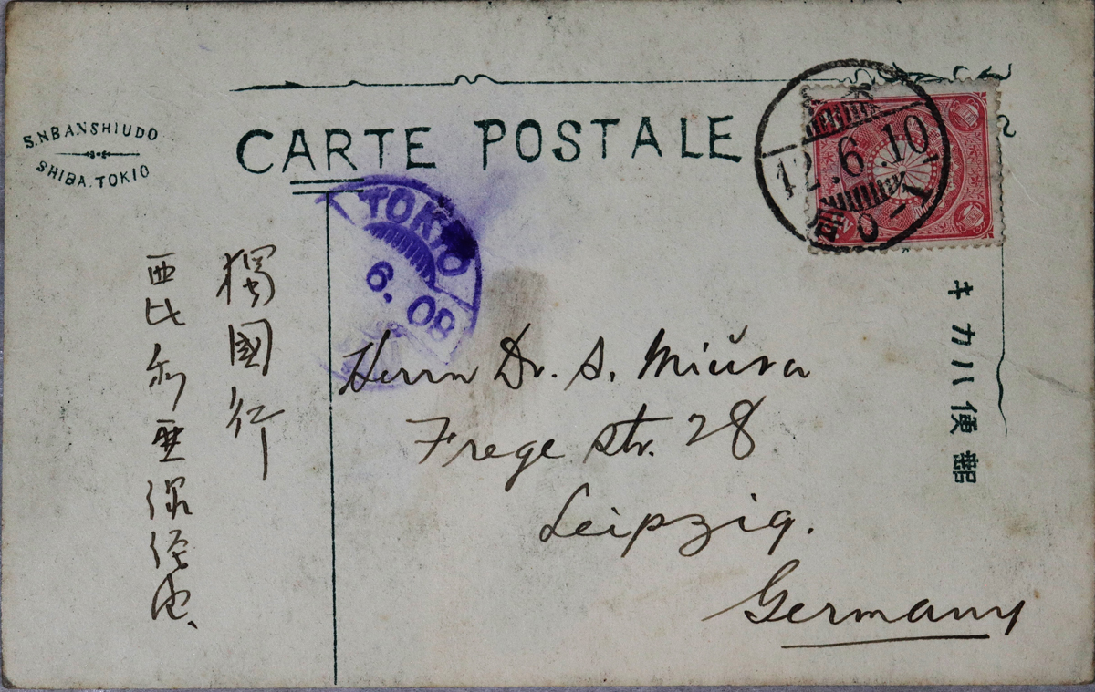 - 内容:「五月廿六日着京 諸事は日本に限るネ。早く帰って来ないか、芸者は美しいよ。然し我輩はまだ試みる気になれん、故如何ことなればカヽア●らしければな●。日銀本店 豊より」/絵種別:写真/絵分類:文化/絵国名:日本/絵内容:女性|バイオリン|着物|束髪|スタジオ|娘/絵柄の種類:文化/留学期間:再びライプチヒ大学時代/三浦と葉書の関係:三浦宛