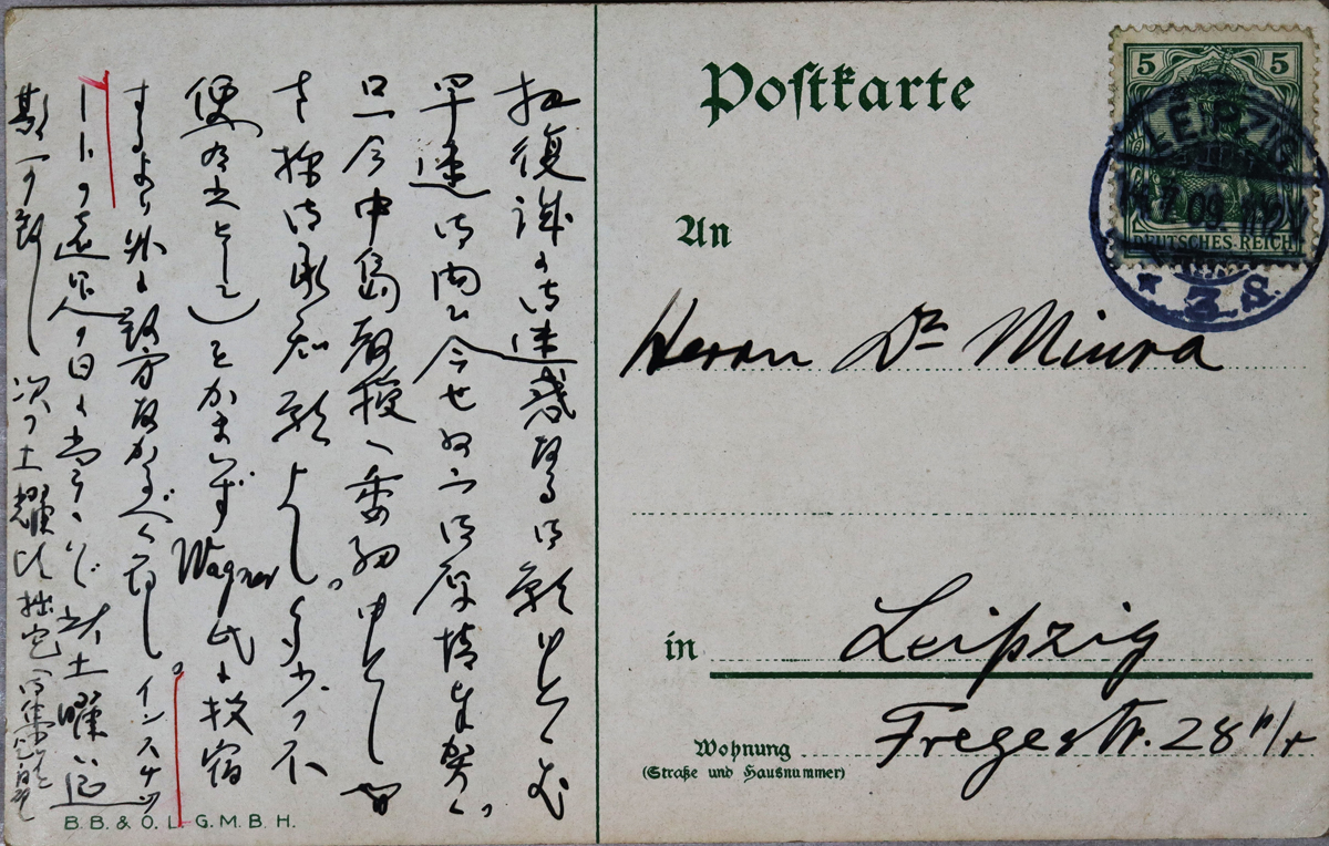 - 内容:問い合わせへの回答への礼状。島教授に委細連絡する。/絵種別:絵/絵分類:風景/絵国名:ドイツ/絵内容:ライプツィヒ|ライプツィヒ大学|創立500年記念|軍人|デザイン/絵柄の種類:風景(ドイツ)/留学期間:再びライプチヒ大学時代/三浦と葉書の関係:三浦宛