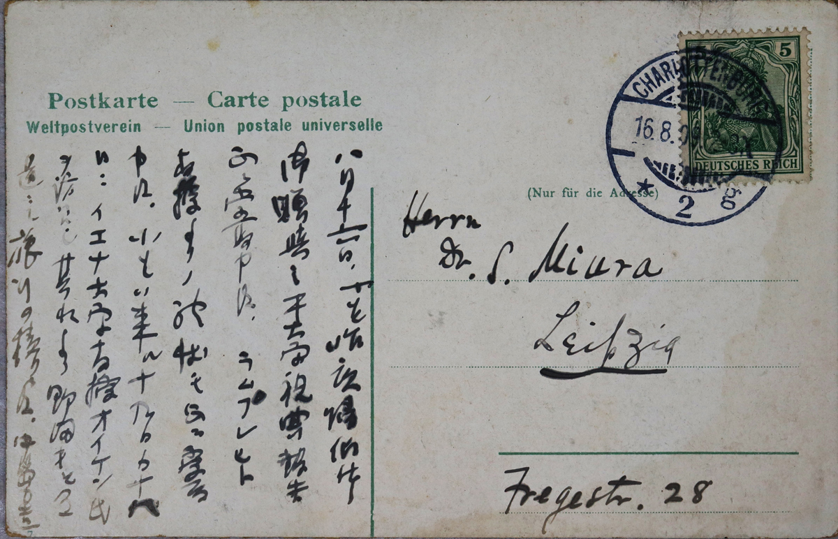 - 内容:近況報告。ラムプレヒト教授よりの手紙を拝受した。19日か18日イエナ大学教授オイケン氏を訪問。それより野田氏と旅行のつもり。/絵種別:写真/絵分類:風景/絵国名:ドイツ/絵内容:ベルリン|ネプチューンの噴水/絵柄の種類:風景(ドイツ)/留学期間:再びライプチヒ大学時代/三浦と葉書の関係:三浦宛