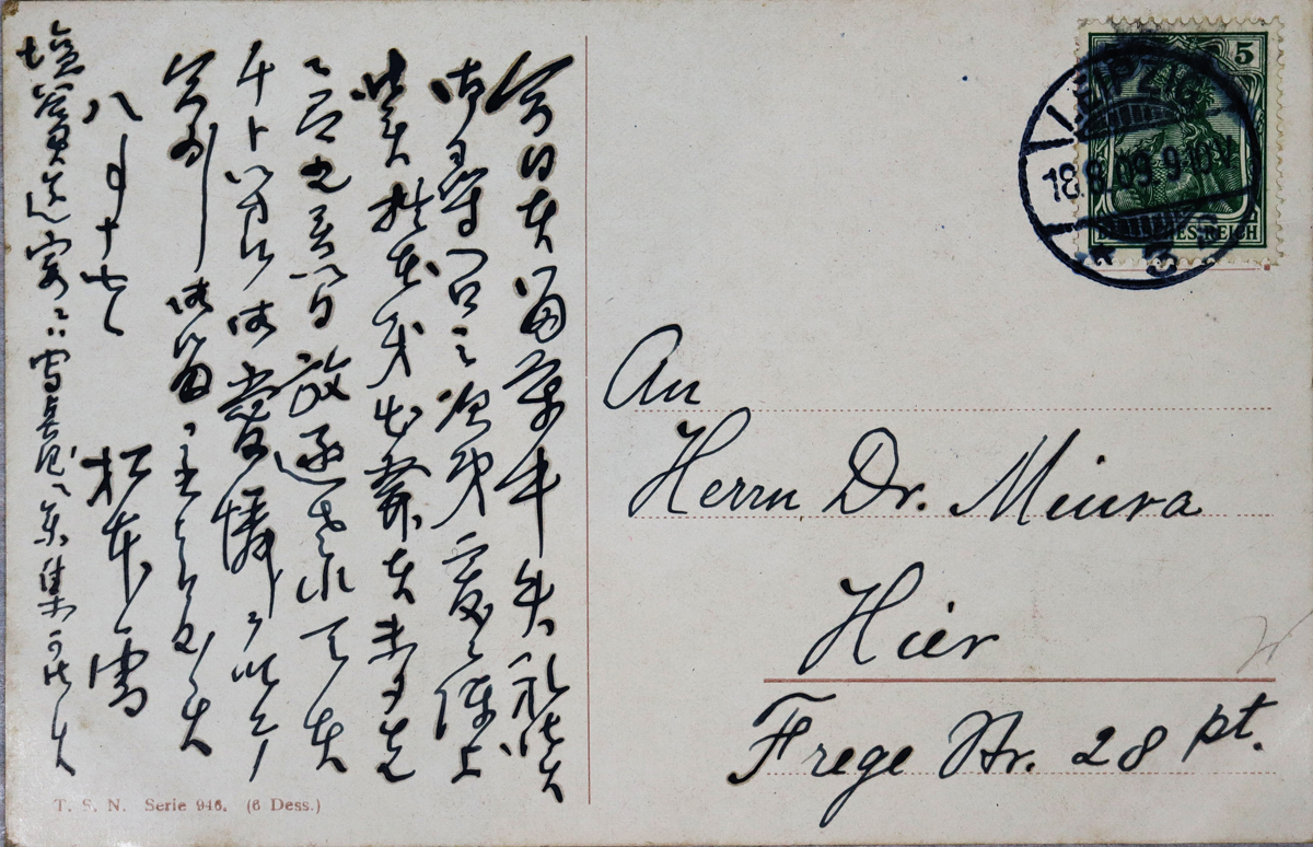 - 内容:塩谷君送別宴は写真屋参集か?/絵種別:絵/絵分類:文化/絵国名:ドイツ/絵内容:戯画|動物|擬人化|犬|狩猟服/絵作者・発行社:?/絵柄の種類:文化/留学期間:再びライプチヒ大学時代/三浦と葉書の関係:三浦宛