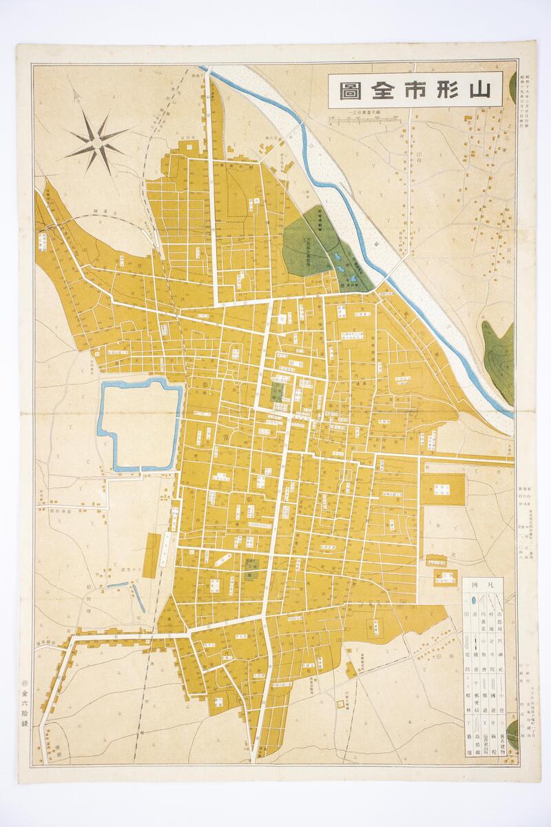 | 備考 | 縮尺1万分の1の山形市街の地図。市郡境・村境・川溝渠・池・田・神社・寺院・教会・鉄道・堤防・小径・国道・県道・郵便局・樹林・著名建物・病院・巡査派出所・高低線・桑畑を図示している。同じものが001-002-000015にあり。 |