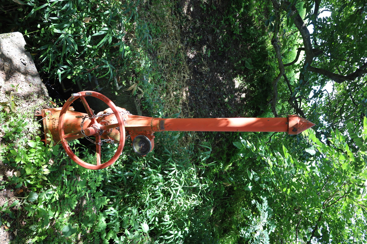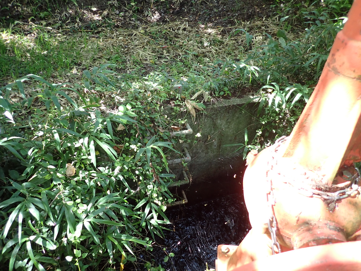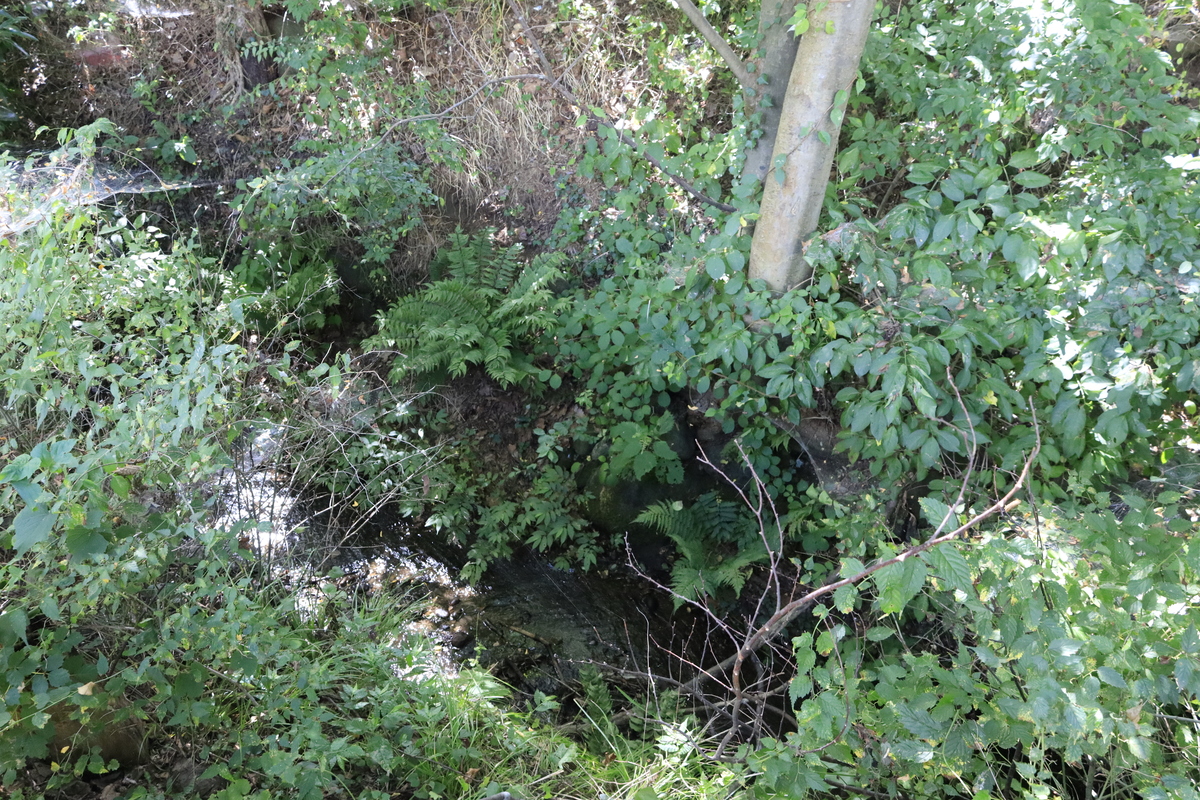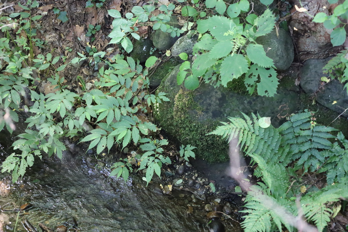 笹堰最上流部は、草木が生い茂っており、苔の生えた石積みが見られる。