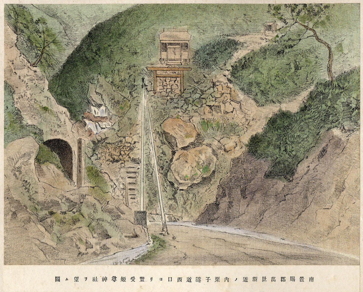〔絵画〕三島県令道路改修記念画帖 其之三 南置賜郡万世新道ノ内栗子隧道西口ヨリ豊受姫尊神社を望ム図