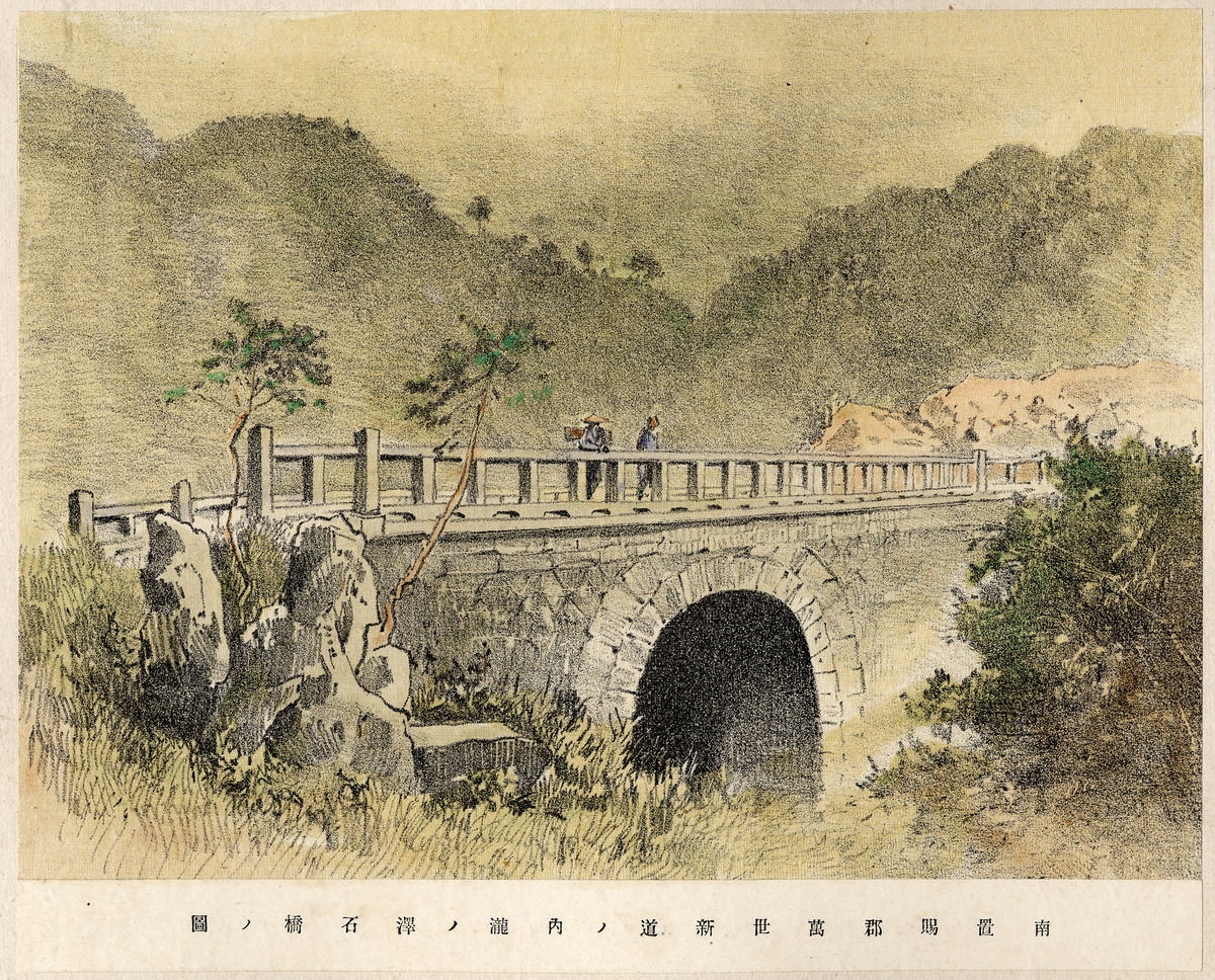 〔絵画〕三島県令道路改修記念画帖 其之三 南置賜郡万世新道ノ内瀧ノ澤石橋ノ図
