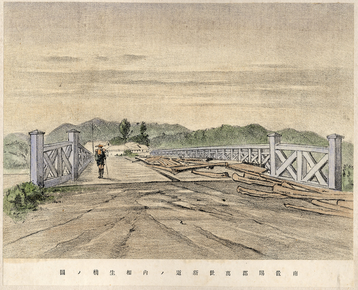 〔絵画〕三島県令道路改修記念画帖 其之三 南置賜郡万世新道ノ内相生橋ノ図
