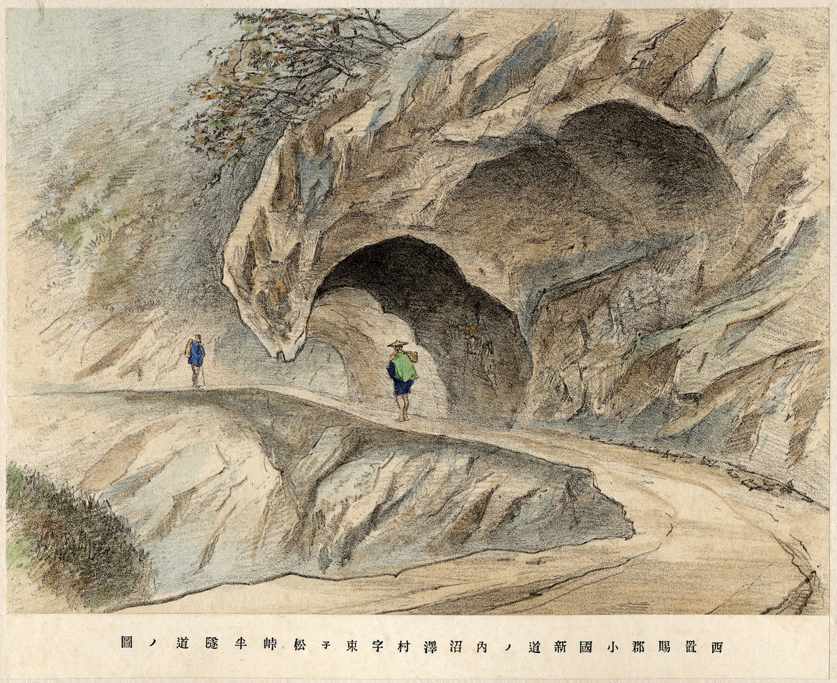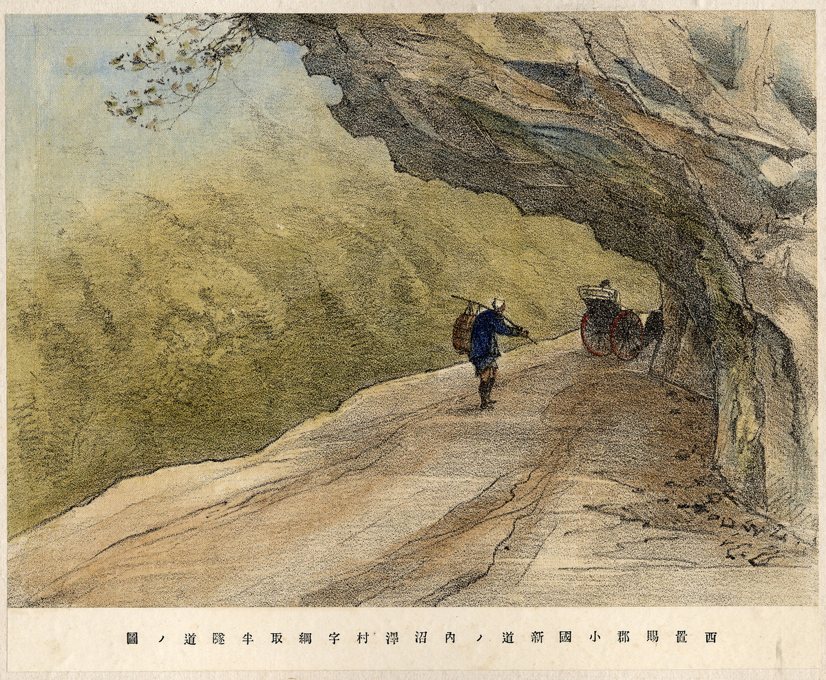 〔絵画〕三島県令道路改修記念画帖 其之三 西置賜郡小国新道ノ内沼沢村字束子松峠半隧道ノ図