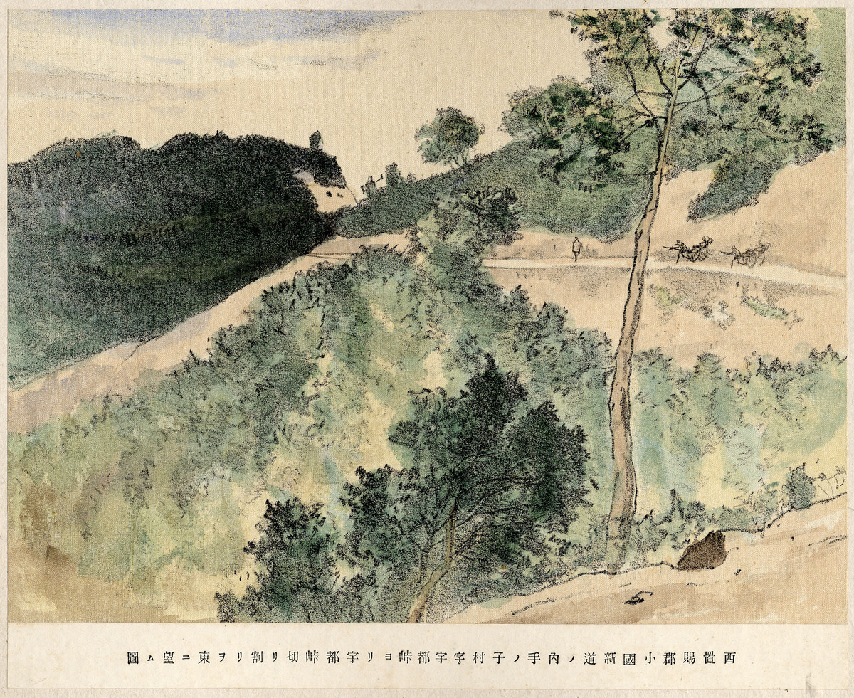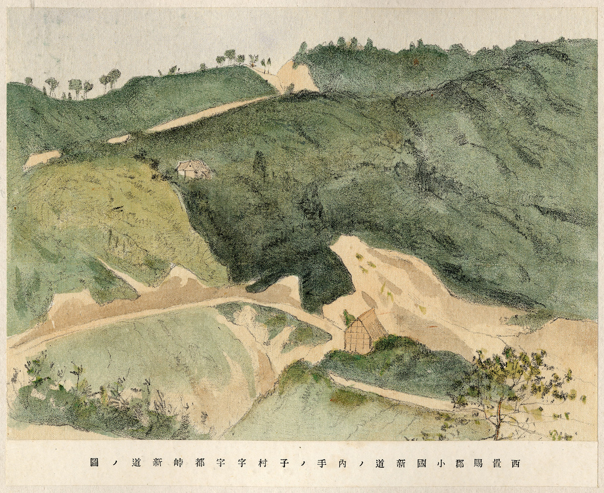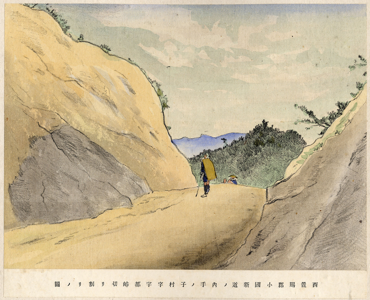 〔絵画〕三島県令道路改修記念画帖 其之三 西置賜郡小国新道ノ内手ノ子村字宇津峠新道ノ図