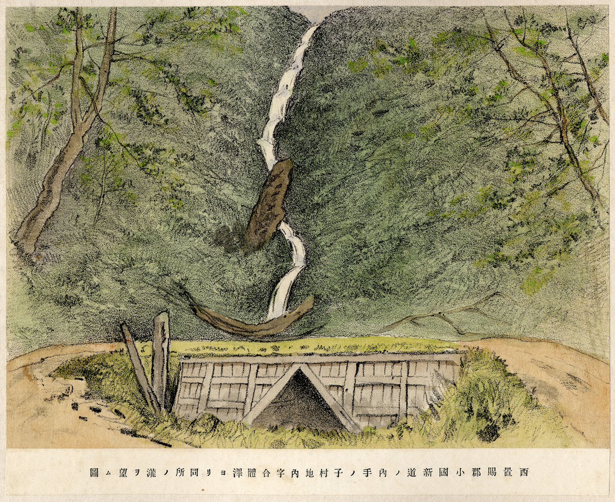 〔絵画〕三島県令道路改修記念画帖 其之三 西置賜郡小国新道ノ内手ノ子村地内字合体沢ヨリ同所ノ滝ヲ望ム図