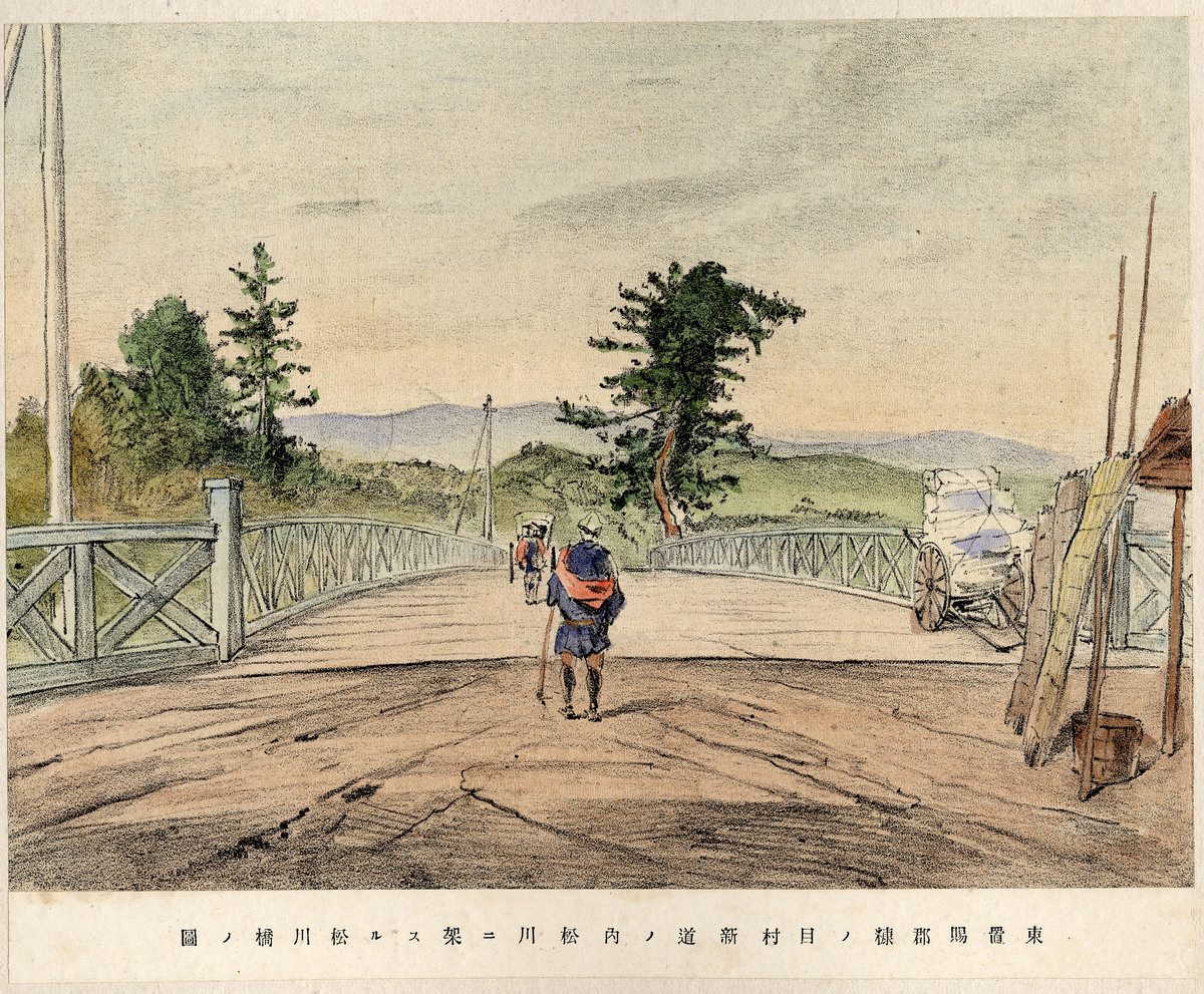 〔絵画〕三島県令道路改修記念画帖 其之三 東置賜郡糠ノ目村新道ノ内松川ニ架スル松川橋ノ図