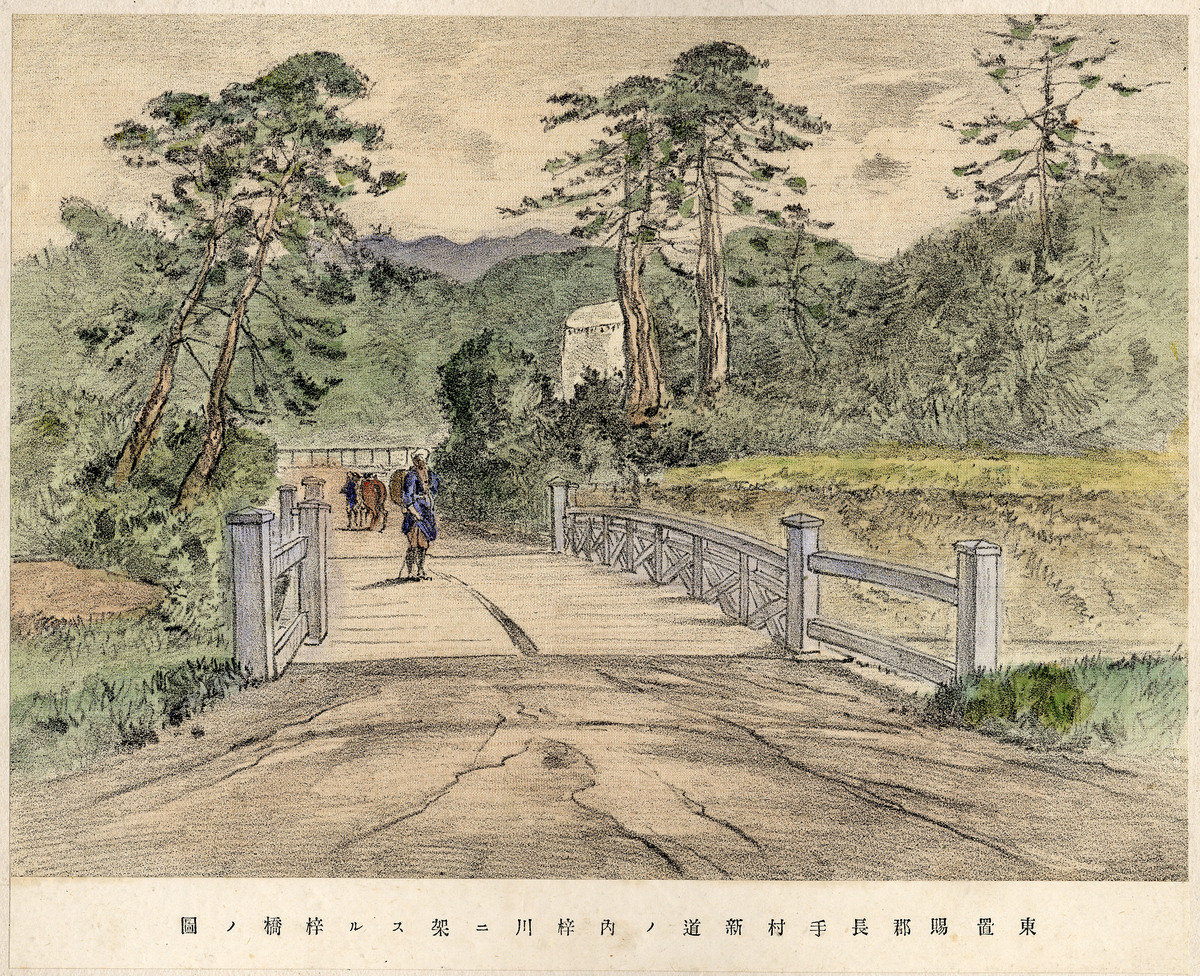 〔絵画〕三島県令道路改修記念画帖 其之三 東置賜郡長手村新道ノ内梓川ニ架スル梓橋ノ図