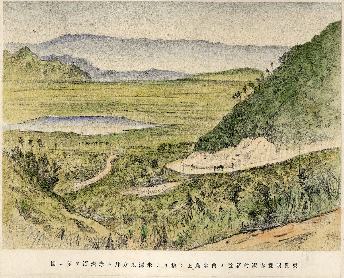 〔絵画〕三島県令道路改修記念画帖 其之三 東置賜郡赤湯村新道ノ内字鳥上ヶ坂ヨリ米沢地方幷ニ赤湯沼ヲ望ム図