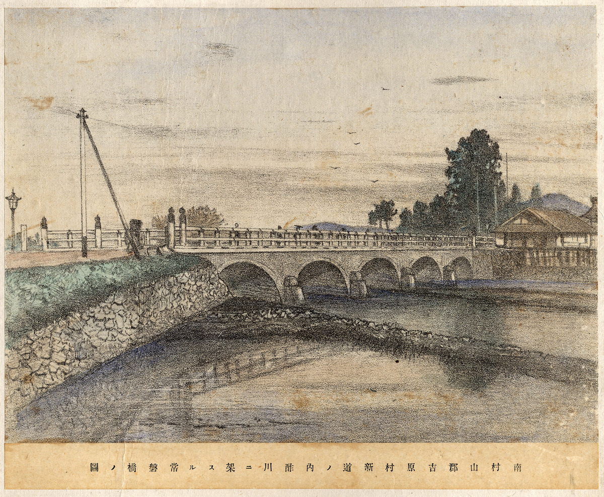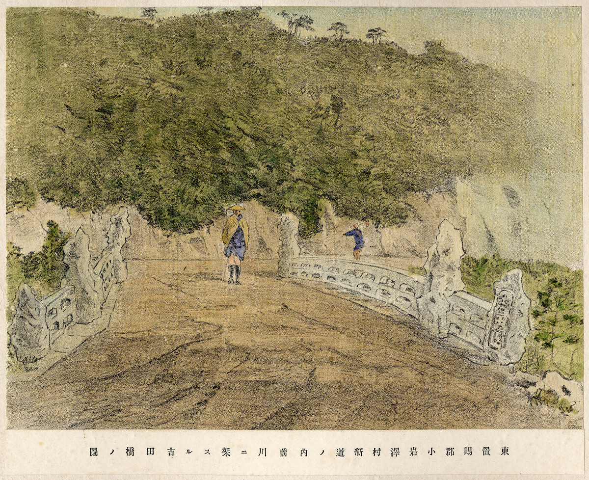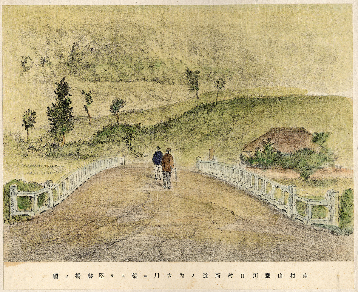 〔絵画〕三島県令道路改修記念画帖 其之三 南村山郡川口村新道ノ内大川ニ架スル堅磐橋ノ図