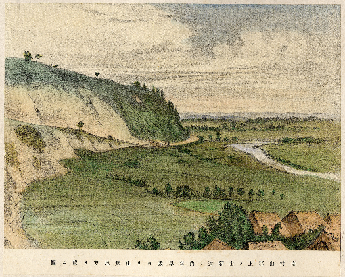 〔絵画〕三島県令道路改修記念画帖 其之三 南村山郡上ノ山新道ノ内字早坂ヨリ山形地方ヲ望ム図