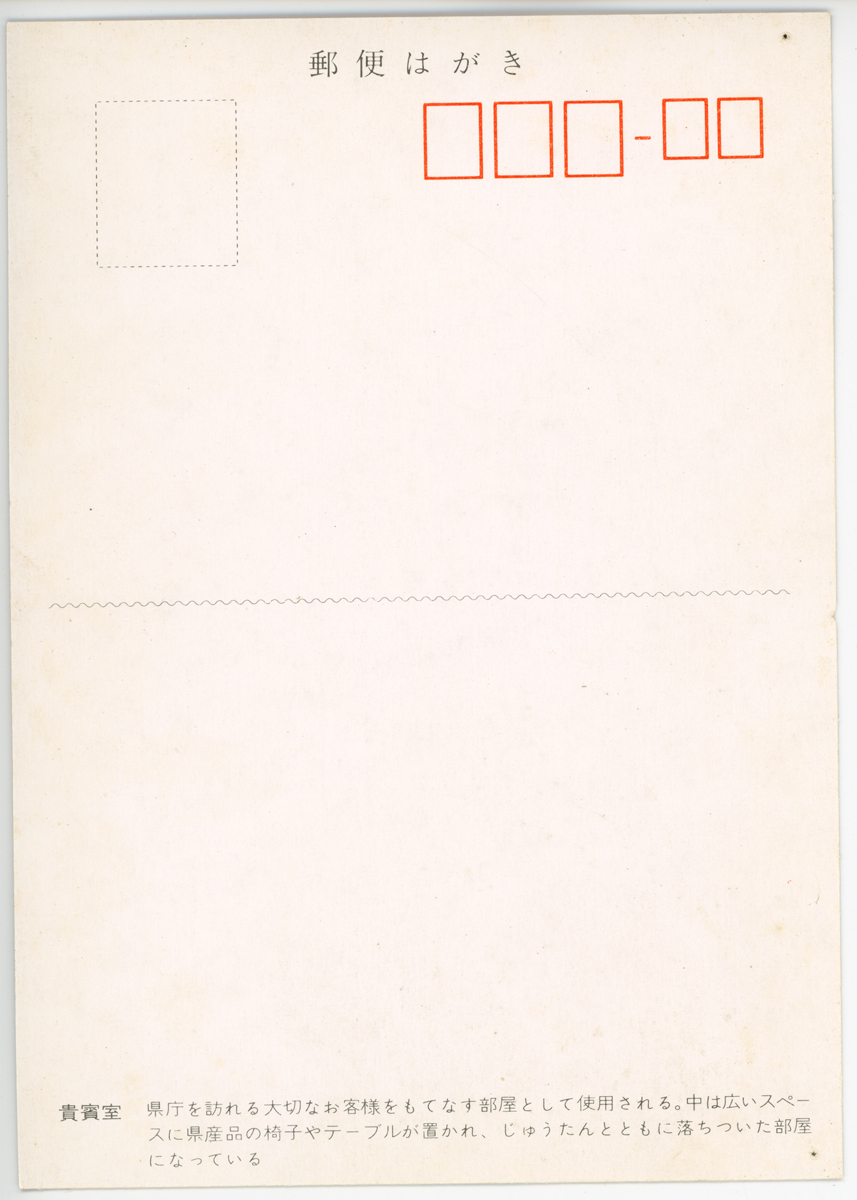 〔絵葉書〕(裏)貴賓室 県庁を訪れる大切なお客様をもてなす部屋として使用される。中は広いスペースに県産品の椅子やテーブルが置かれ、じゅうたんとともに落ち着いた部屋になっている