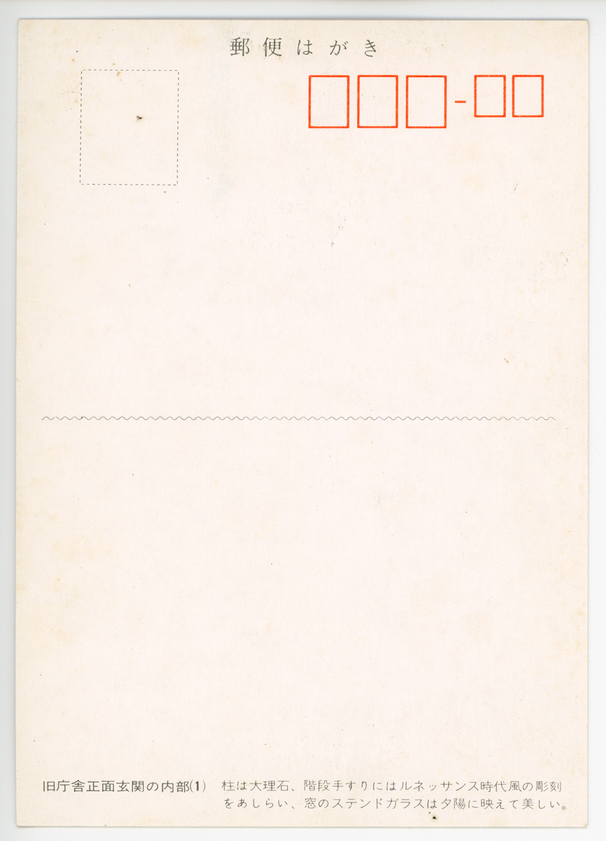 〔絵葉書〕(裏)旧庁舎正面玄関の内部(1) 柱は大理石、階段手すりにはルネッサンス時代風の彫刻をあしらい、窓のステンドガラスは夕陽に映えて美しい。