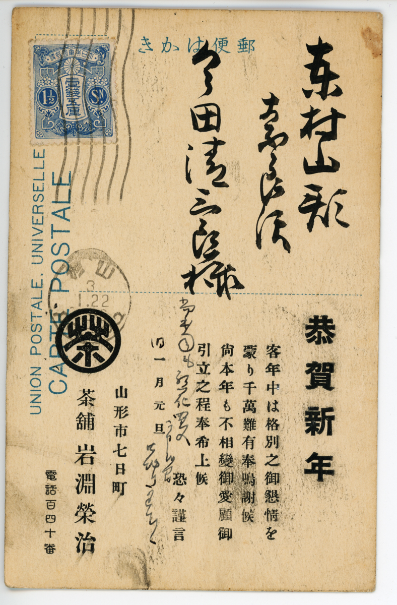 | 備考 | 岩淵榮治が今田清三郎へ宛てた年賀状。岩淵本舗と山城宇治名茶園を撮影。消印「山形 3 1.22」。 |