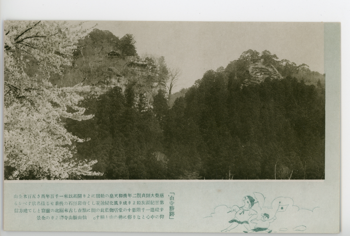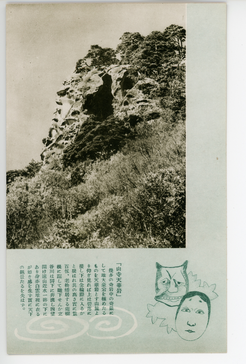 〔絵葉書〕「山寺勝跡」慈覚大師貞観二年正和天皇の勅願により開基以來一千百年高さ五百米全山第三紀凝灰岩より成り風化浸食著しく奇岩怪…