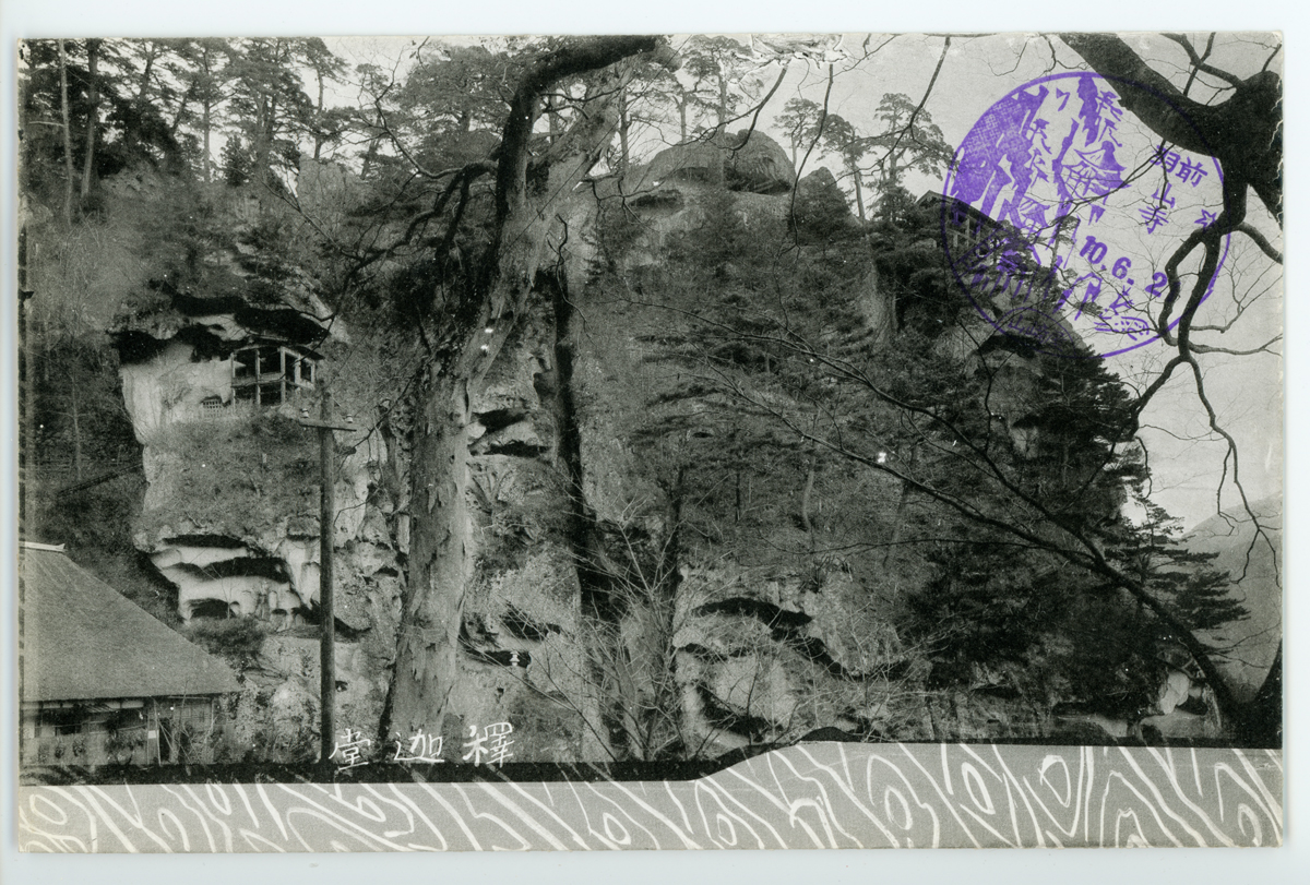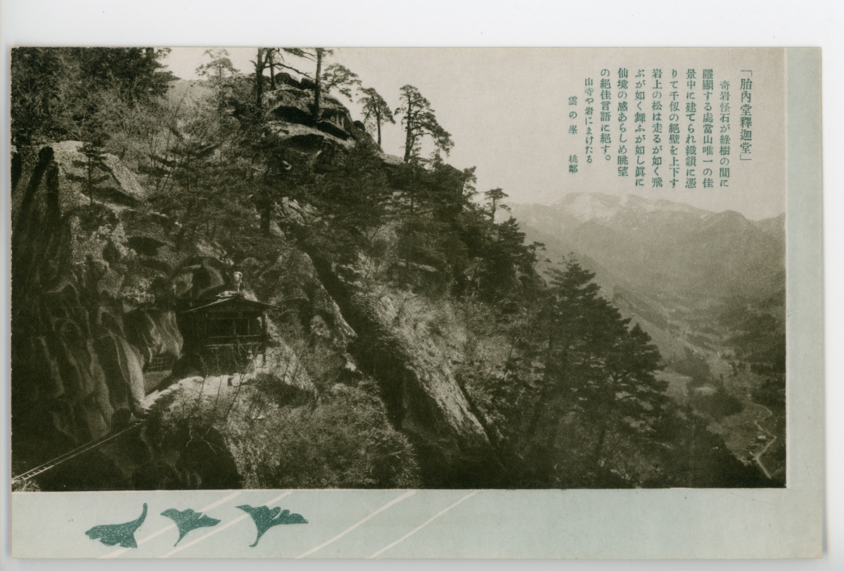 〔絵葉書〕「胎内堂釋迦堂」 奇岩怪石が綠樹の間に隱顯する處當山唯一の佳景中に建てられ鐵鎻に憑りて千仞の絶壁を上下す岩上の松は走る…