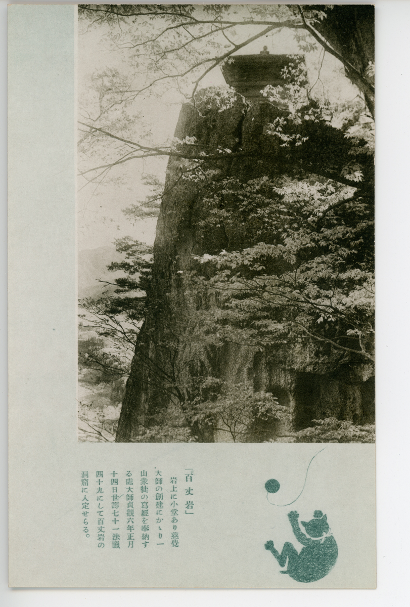 〔絵葉書〕「百丈岩」岩上に小堂あり慈覚大師の創建にかゝり一山宗徒の寫經を奉納する處大師貞観六年正月十四日世壽七十一年法臘四十九に…