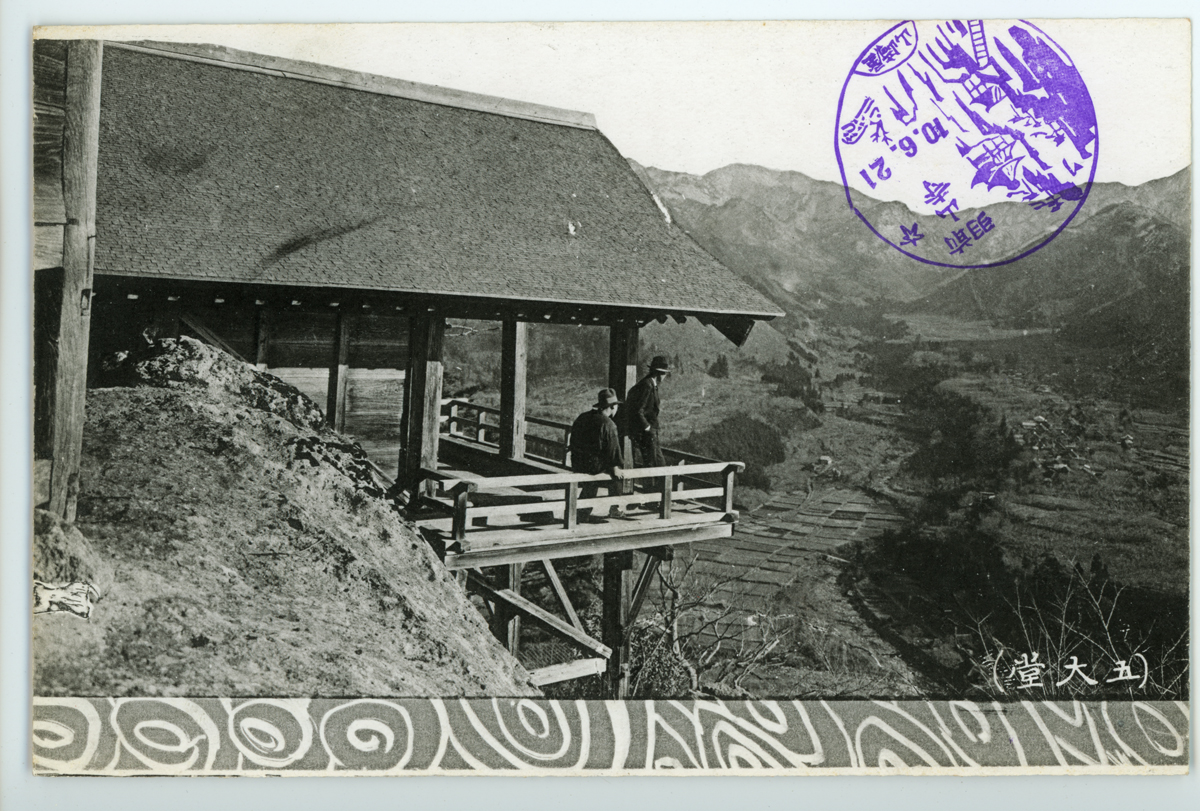 〔絵葉書〕「五大堂」 開山大師秘法を修して久住を祈りし遺蹟なり梵鐘あり、立ちて下瞰すれば立谷川の溪谷美、近く點々する村落指呼の間…
